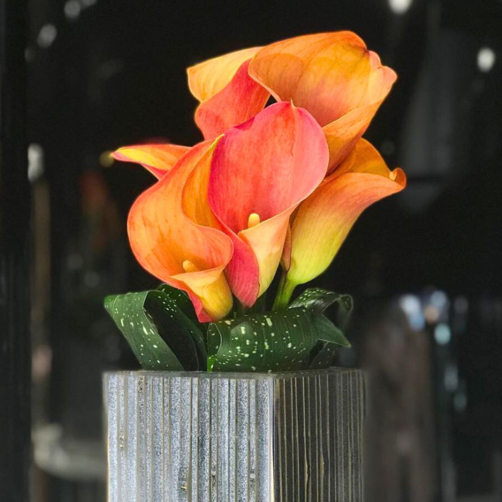 Embrace the beauty and versatility of calla lilies in autumn, emphasizing their deep purple, orange, and yellow hues. These flowers are perfect for fall bouquets,